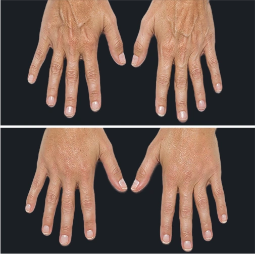 Шея и кисти рук как маркеры возраста требуют особенного ухода. Продлить молодость области шеи и декольте возможно и инъекционными, и аппаратными методиками. А вот эффективное омоложение кожи рук возможно только с помощью филлеров. Radiesse – единственный филлер, одобренный FDA для коррекции возрастных изменений кистей рук. Одна 20 минутная процедура запускает в тканях выработку собственного коллагена, за счет чего возвращается утраченный объем тканей, улучшается цвет и общее качество кожи. Заметный эффект сразу после процедуры, а затем в течение 12 недель нарастает и держится на протяжении 1,5 — 2 лет.